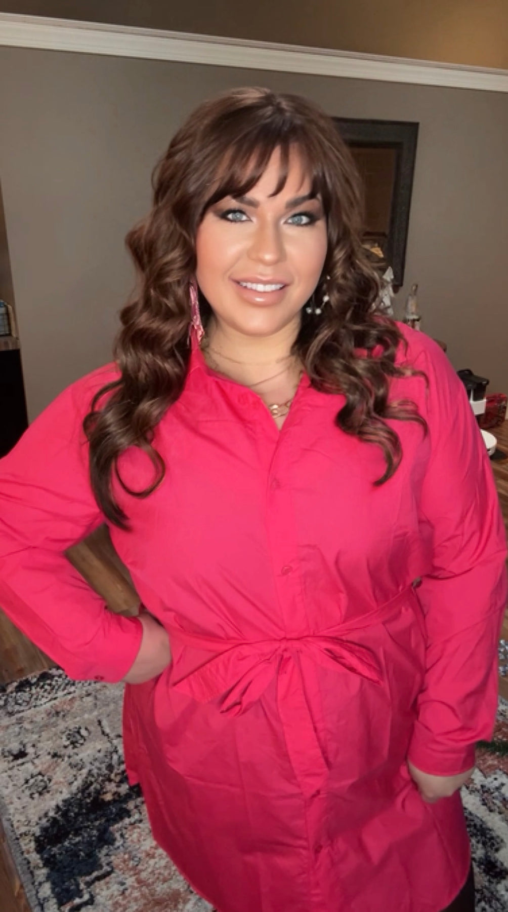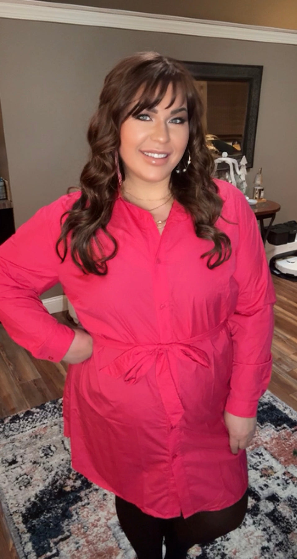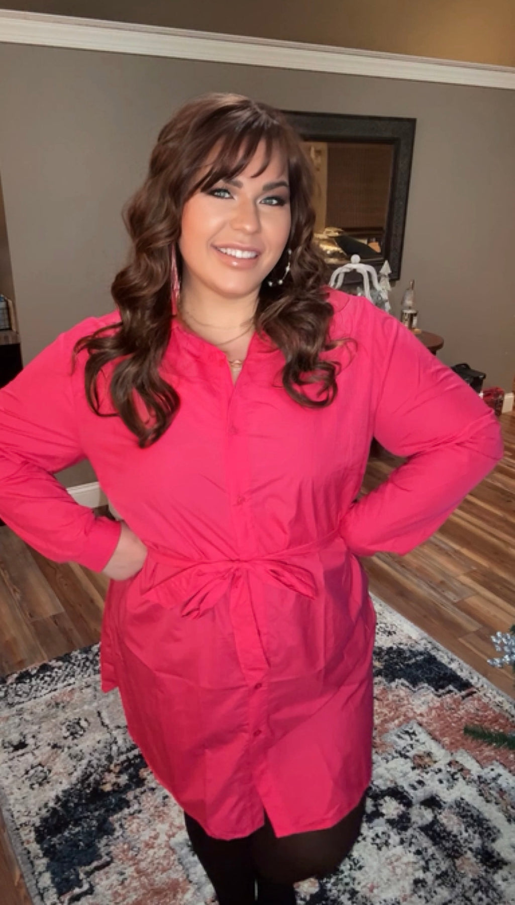 This hot pink tie front shirt dress is for all year long! We love the collar detail with button closure on front. Easy to dress up and down with this shirt dress! Non sheer, woven.