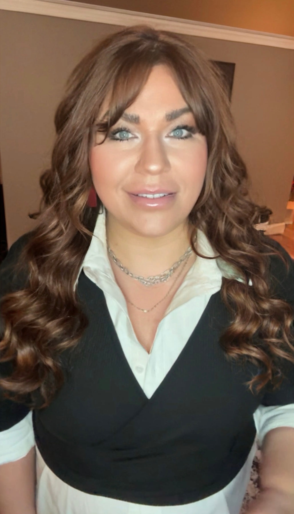 A black long sleeve solid knit top with a surplice front featuring a relaxed fit. Fabric is a lightweight ribbed knit.