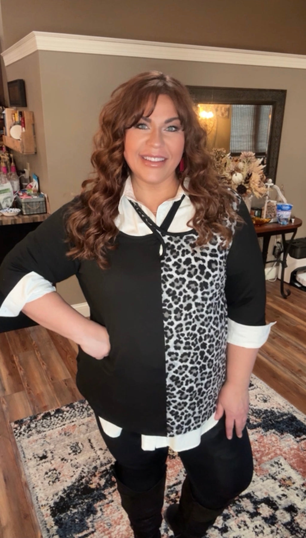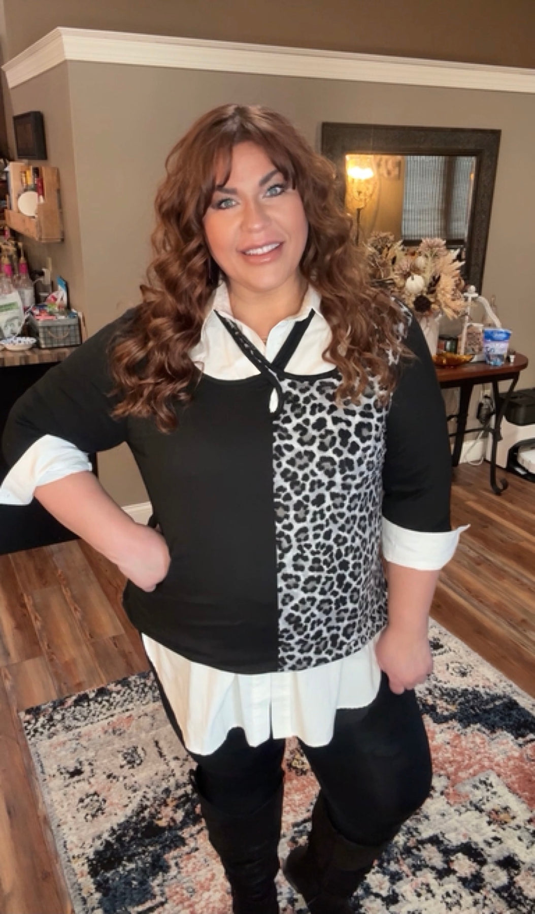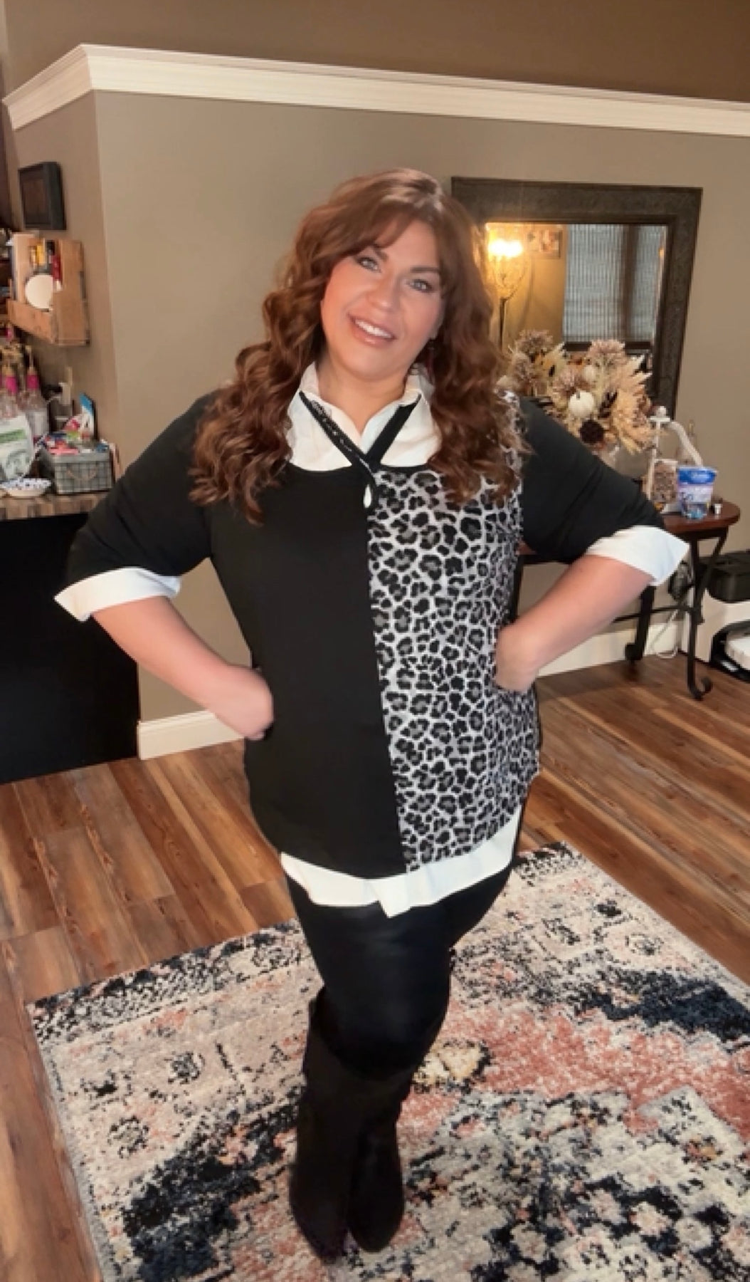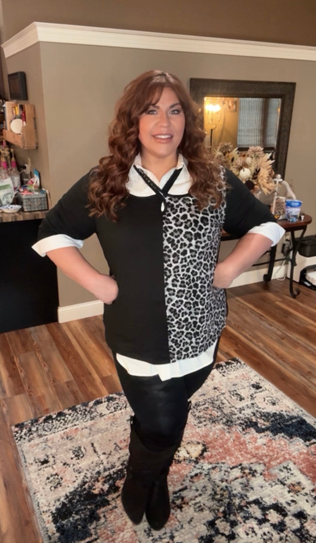 Leopard Animal Print Black Color Block Cut out Cross Neck Detail Knit Top